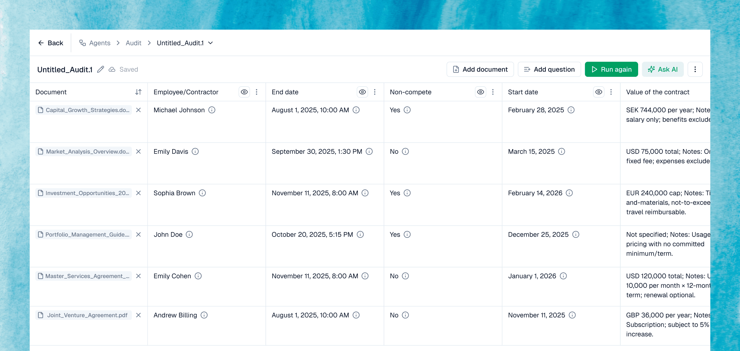 Generate reports for compliance, M&A, or internal reviews in one click.