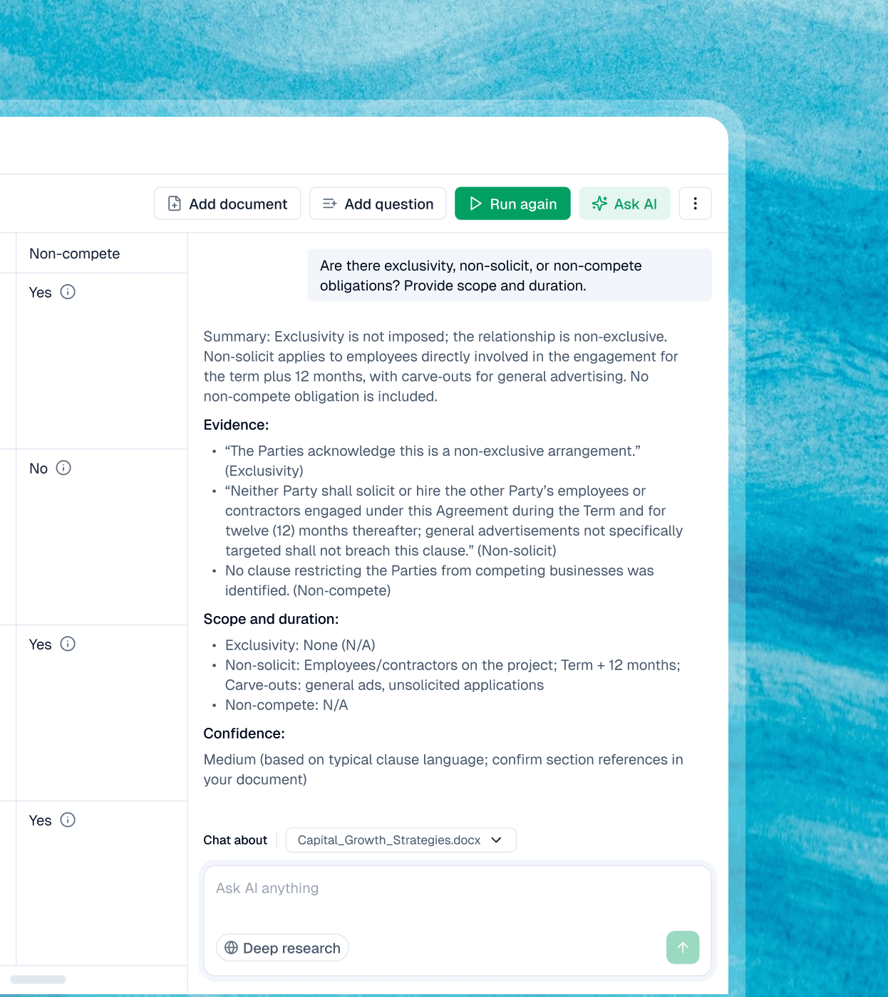 any contract, clause, or dataset in seconds. Surface key terms, risks, and summaries without hours of manual review.