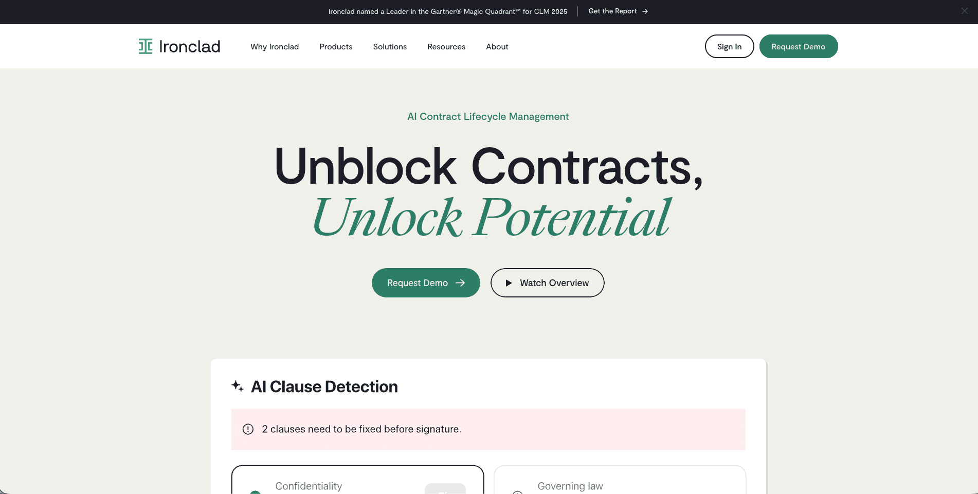 Ironclad is a contract lifecycle management (CLM) platform that has evolved to include AI features for redlining, clause analysis, and workflow automation.