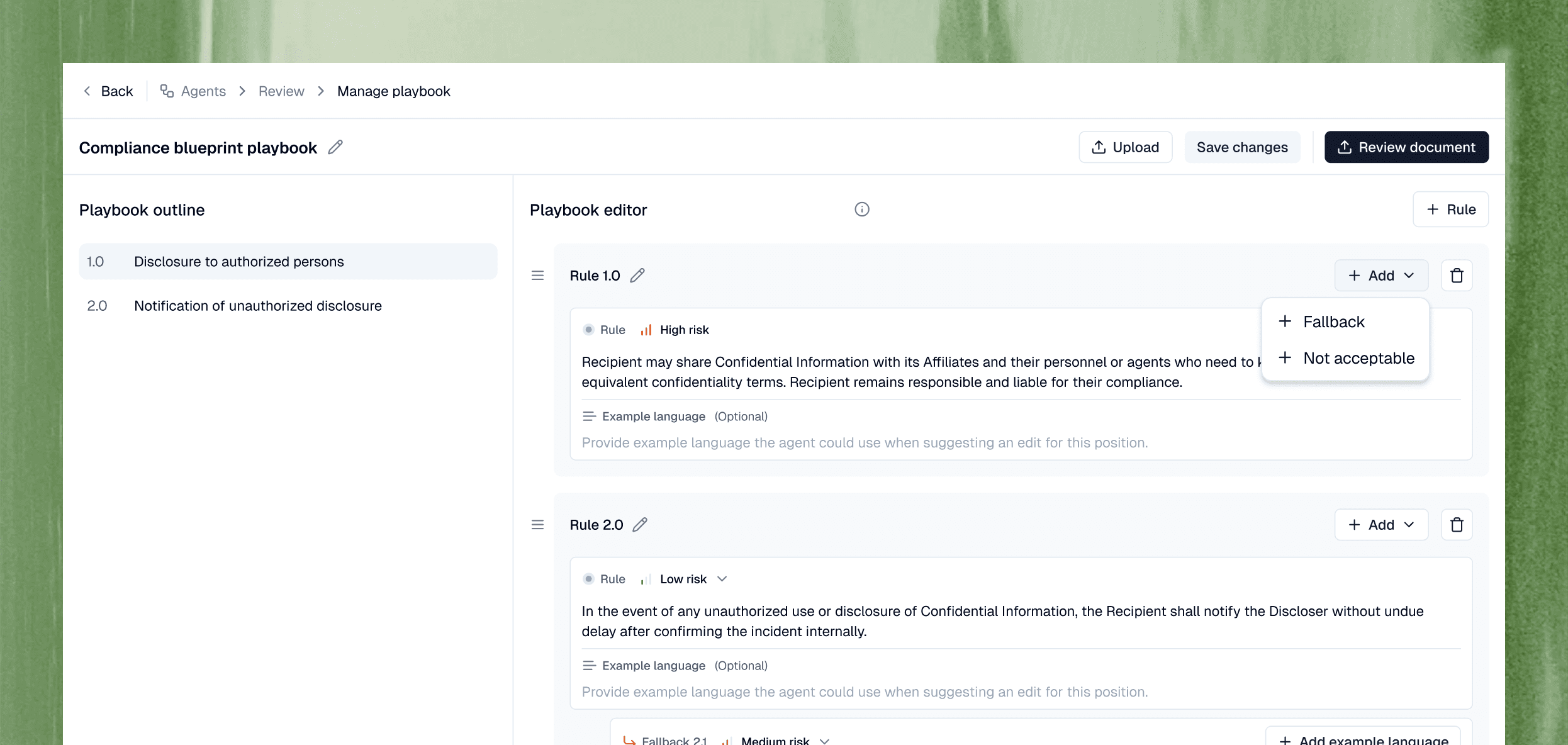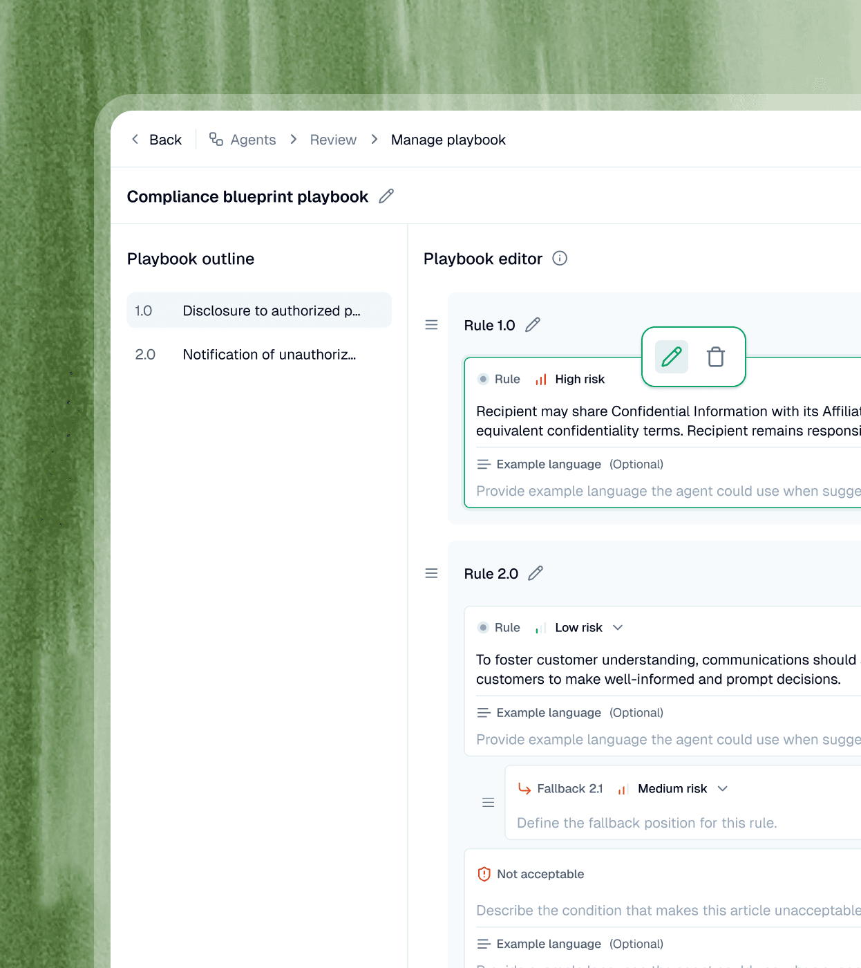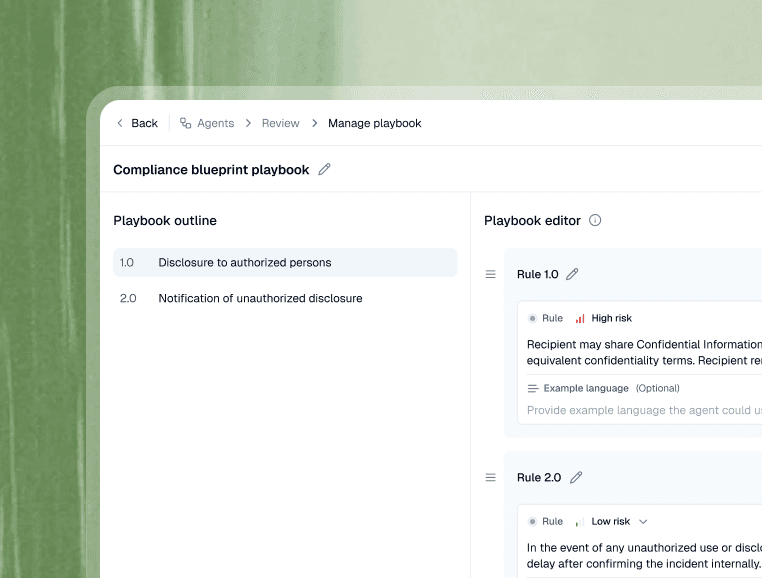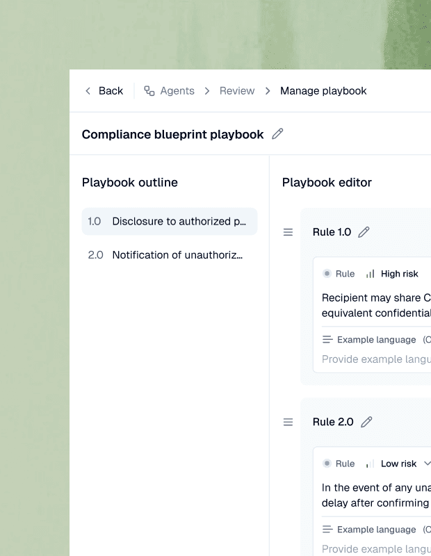 Build playbooks that define what "perfect" looks like for your team - your rules, fallbacks, and not-acceptable positions guiding every approval.